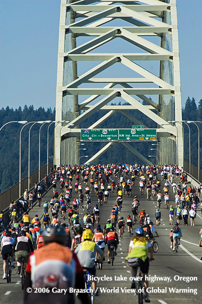Hundreds of bicyclists take over the Interstate-405 bridge in Portland Oregon during the Bridge Pedal biking day. This is extreme (so far), but many cities are restricting car lanes in favor of bikes and walking.