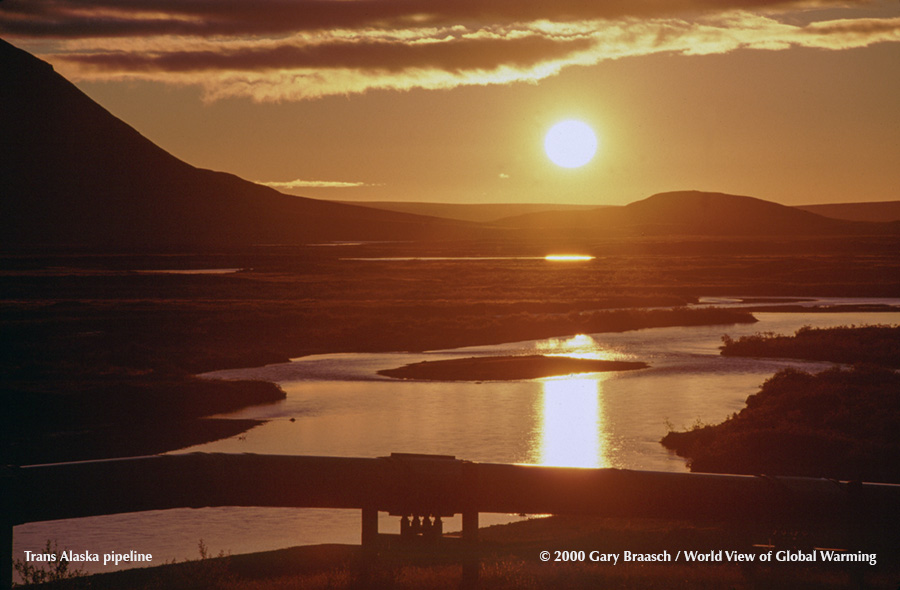 Trans Alaska Oil Pipeline crossing tundra and Atigun River under low summer sun.