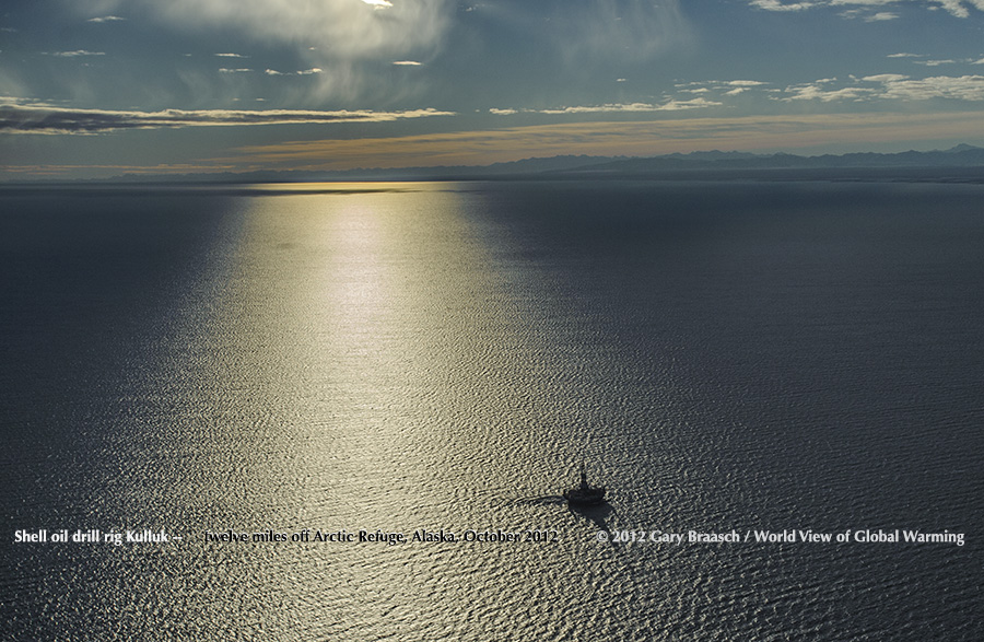 Shell Oil floating oil rig Kulluk on position over one of Shell’s Beaufort Sea federal leases in October 2012 — only 12 miles off protected coast of the Arctic National Wildlife Refuge, Alaska. Kulluk later was wrecked in the tow-back. See http://www.worldviewofglobalwarming.org/shelldrillrig/index_2.php
